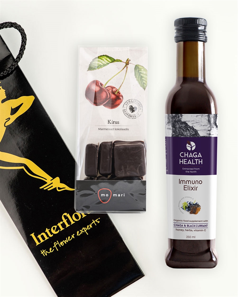 Kinkekott chaga ja mustsõstra eliskiiriga (250 ml) ja MoMari hapuka kirsimarmelaadiga tumedas šokolaadis (150 g).